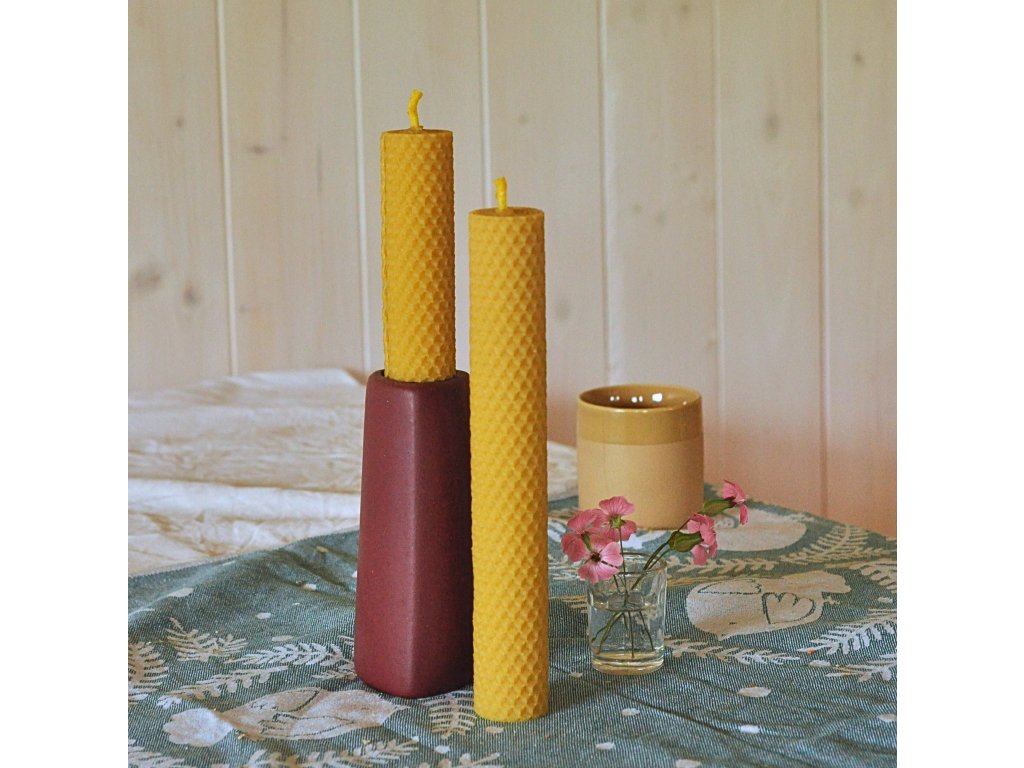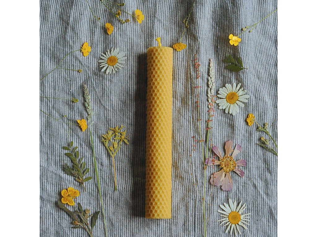 Svíčky jsou ručně stáčené z přírodních voskových mezistěn, jejichž jemná struktura zůstává viditelná a dává každému kusu osobitý charakter. Vznikají pomalu a s důrazem na detail, v duchu tradiční práce se včelím voskem.